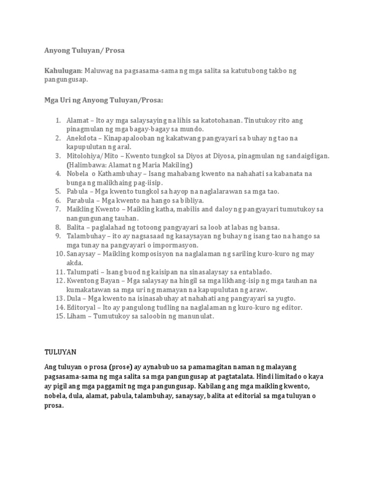 Ano ang anyong tuluyan kahulugan. October 17 2016 rickimaeeee Leave a comment Ang Akademikong Sulatin ay napakahalagang sulatin. Noong 1877 ipinagpatuloy niya ang kanyang pag-aaral sa Unibersidad ng Santos Tomas at Unibersidad. Salawikain mga kasabihan o kawikaan.